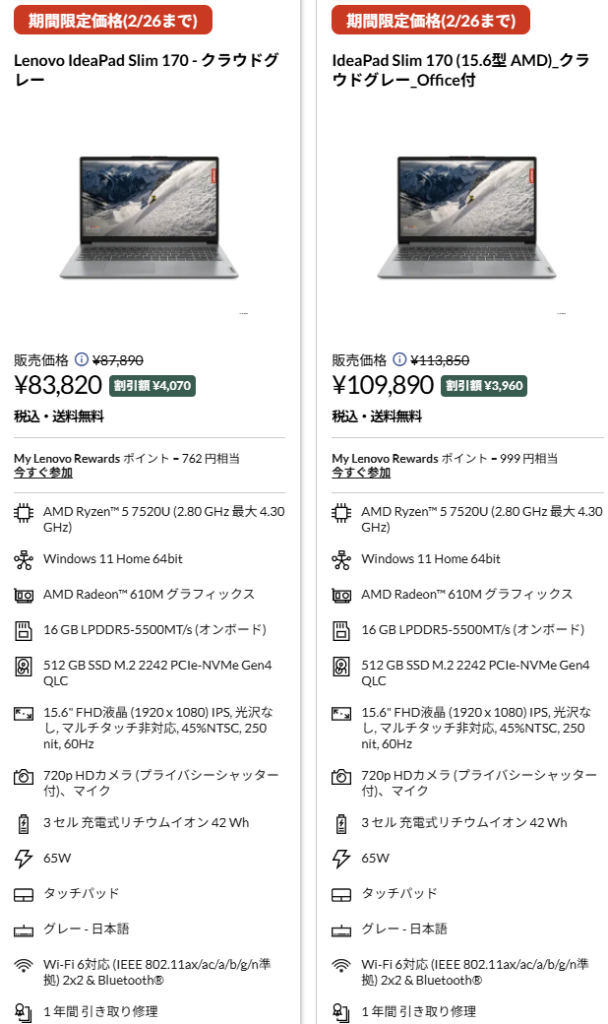- とにかく安く買う:IdeaPad Slim 170(15.6型 / AMD / Office付)セールページで見る