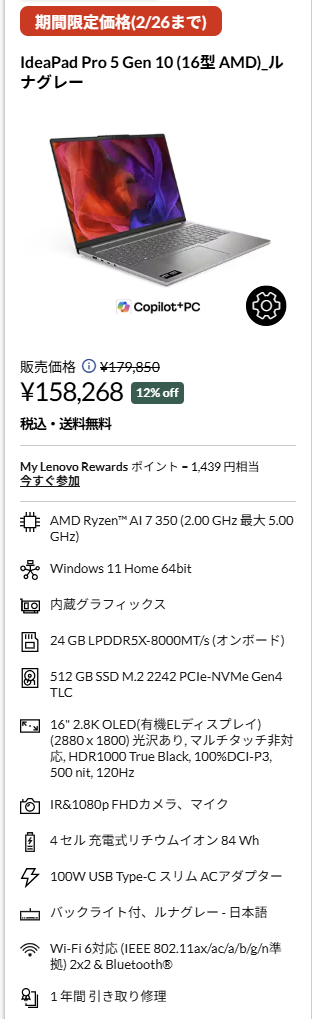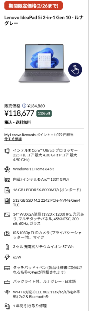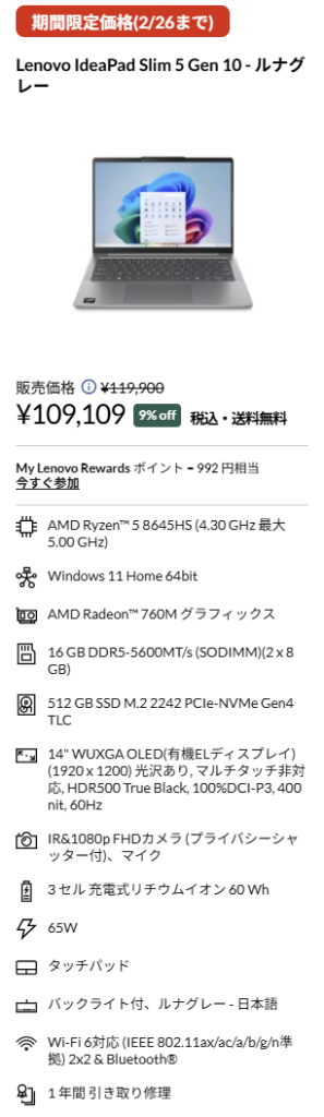 - コスパ重視の万能:IdeaPad Slim 5 Gen 10(14型)セールページで見る