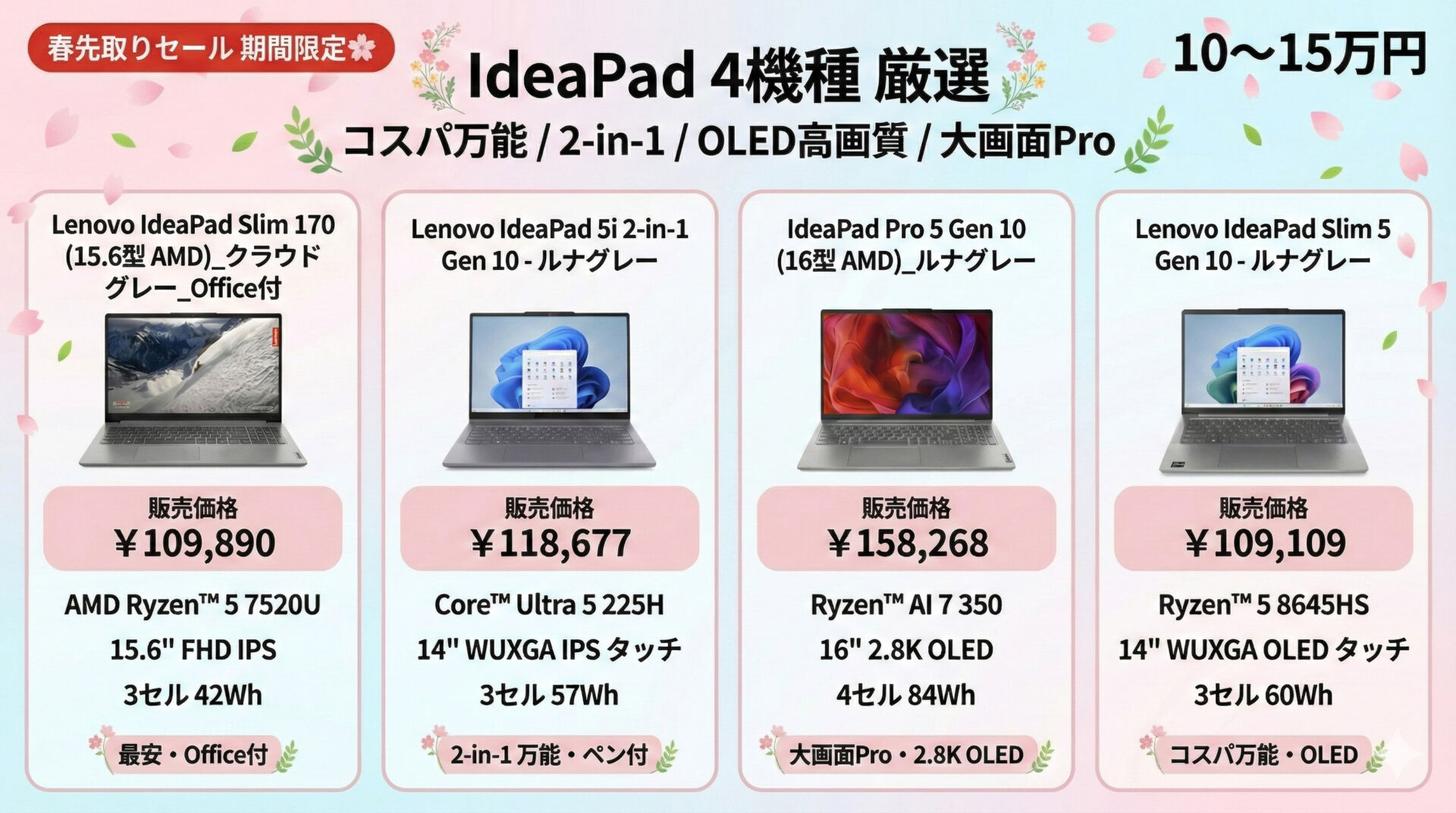 レノボ公式ストアで「春先取りセール」が開催中で、2月26日(木)までが狙い目です。対象はThinkPadだけでなくIdeaPadも広く、台数・構成固定の“即買い向け”から、カスタマイズ可能な“こだわり向け”まで混在しています。