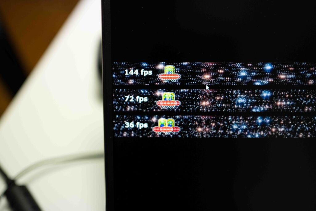 リフレッシュレートは144Hzに対応しています。一般的な60Hzパネルと比べて、画面の更新回数が大幅に増えるため、視点移動やキャラクターの動きがヌルっと滑らかに見えるのがメリットです。