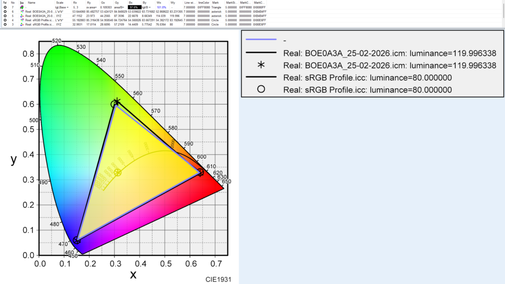 ディスプレイの色域は、sRGBカバー率97.6%でした。ほぼsRGBを一通りカバーできているので、Webコンテンツや一般的な写真・動画の見え方は素直で、色が極端に薄い/転ぶといった不満は出にくい水準です。