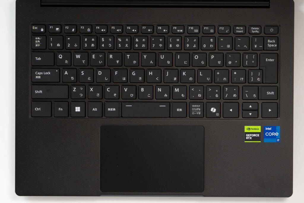 キーボードは英字配列をベースにしつつ、日本語入力用の刻印も入れたタイプです。ゲーミングノートにありがちな派手なキー形状ではなく、見た目はかなりシンプルで、どちらかと言えばビジネスノートPCに近い方向性。打鍵感も“ふわふわ”ではなく、クリック感(反発感)があるタイプなので、文章入力や作業用途でも扱いやすい印象です。