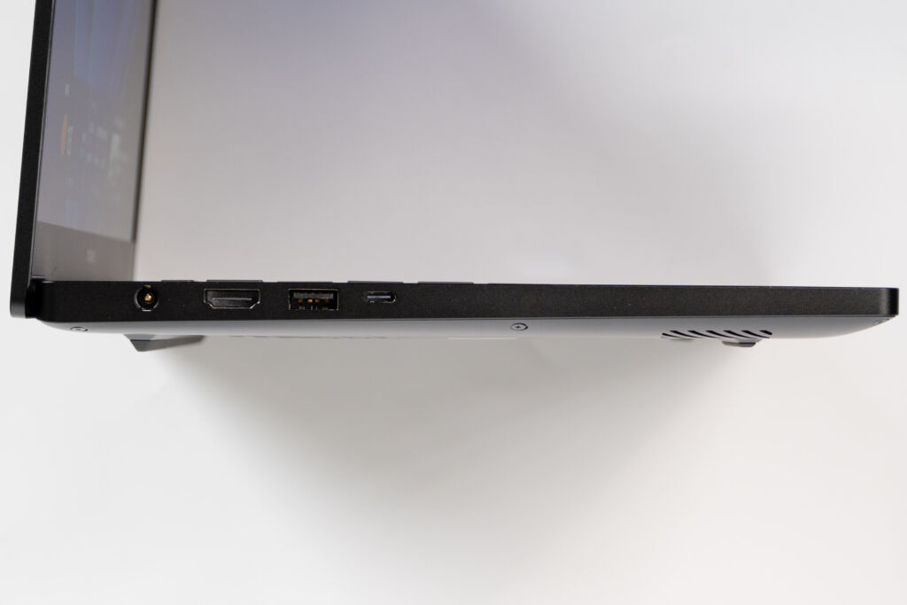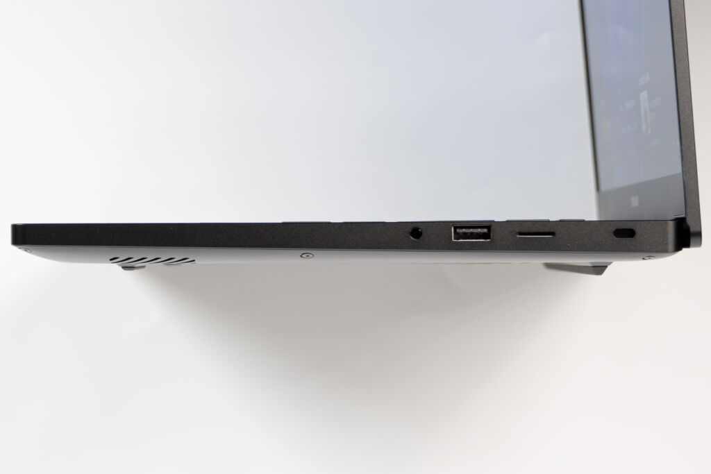 - ワイヤーロック用。持ち運び前提のPCとして、展示会や作業スペースでの盗難対策ができるのは安心材料です。