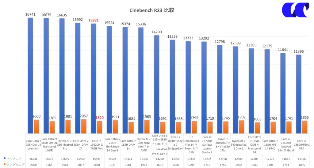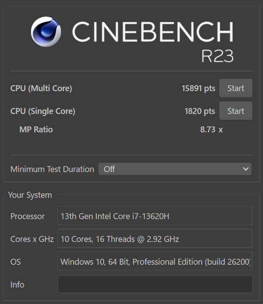 Cinebench R23のスコアは、マルチ 15,891pts/シングル 1,820ptsでした。CPUは**Core i7-13620H(10コア16スレッド)**で、いわゆる最新世代のCore Ultra系と比べると「世代差」はありますが、それでもスコア自体は十分高く、体感としてもキビキビ動くレンジです。