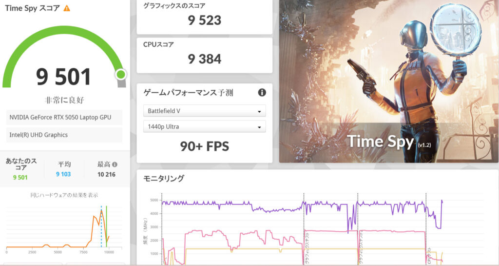 3DMark Time Spyの結果は、総合スコア 9,501/Graphics 9,523(RTX 5050 Laptop GPU)でした。グラフィックススコアが9,500台に乗っているので、性能レンジとしては“エントリー寄り”ではなく、フルHD〜WUXGAで高画質設定を現実的に狙えるクラスです。