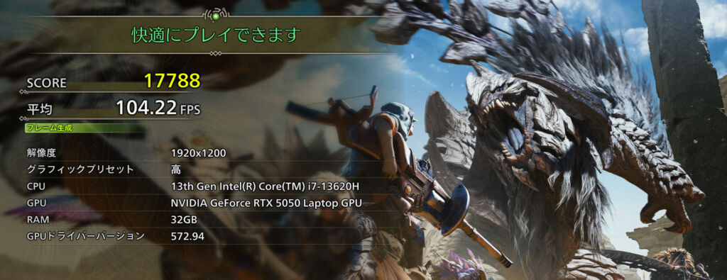 モンスターハンターワイルズのベンチマーク結果は、判定が「快適にプレイできます」でした。設定は1920×1200(WUXGA)/グラフィックプリセット「高」で、スコア17,788/平均104.22fpsを記録しています(フレーム生成有効)。