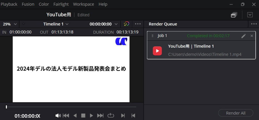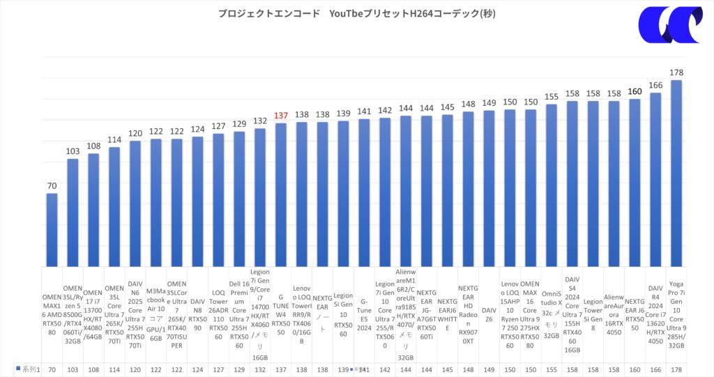 動画のエンコード性能はかなり優秀です。DaVinci Resolveで13分の動画を「YouTubeプリセット/H.264」で書き出ししたところ、完了までの時間は2分17秒(=137秒)でした。