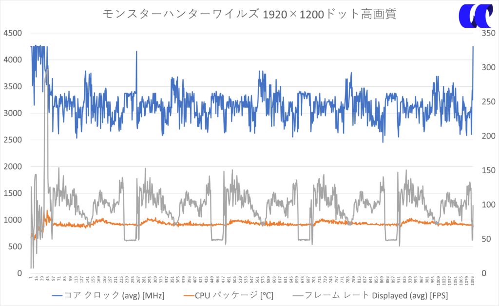 モンスターハンターワイルズ(1920×1200/高画質)実行中のログを見ると、CPU温度・動作周波数・フレームレートの挙動はかなり安定しています。