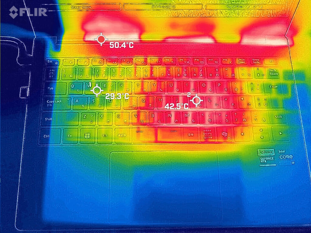 一方で、実際に触れる頻度が高い**WASD付近は約29.3℃**とかなり低めで、操作エリアが熱で不快になりにくいのは好印象です。つまり本機は、排熱の影響が出る場所が「中央・上側」に寄っており、ゲーム操作そのものは快適に維持しやすいが、中央の熱さには気をつけたい──という分かりやすい温度特性だと言えます。