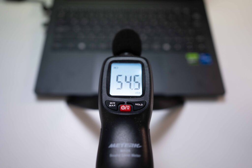 高負荷時のファンの駆動音は、実測で54.5dBでした。ゲーミングノートとしては「しっかり回る」部類で、静かな部屋だとはっきりうるさく感じるレベルです。長時間のゲームやレンダリングでは、音が気になる人は注意したほうがいいですね。