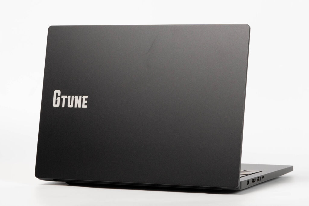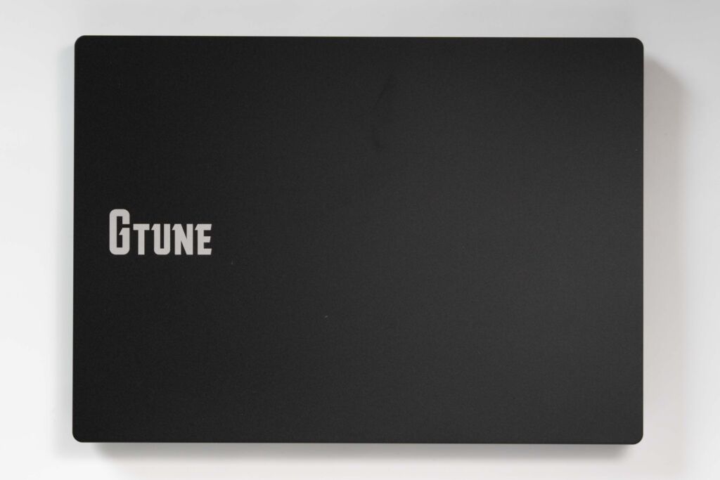 天板はブラック一色でまとめられており、装飾はG TUNEのブランドロゴがプリントされているだけというシンプルなデザインです。主張しすぎない見た目なので、ゲーミングノートとしては落ち着いた印象が強く、場所を選ばず使いやすいタイプだと言えます。