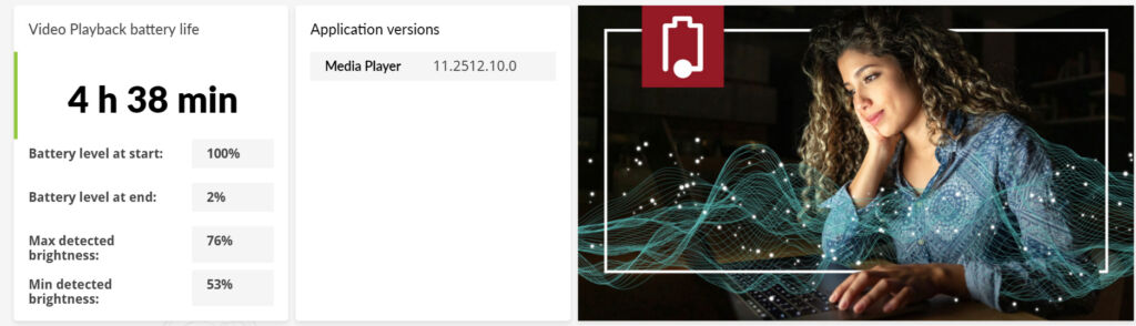 バッテリー駆動時間は、動画再生テストで4時間38分でした(開始100%→終了2%、画面輝度はおおむね53〜76%の範囲)。数値としては「外で一日持つ」タイプではなく、一般的なモバイルノートPCと比べると体感で半分以下になりやすい駆動時間です。