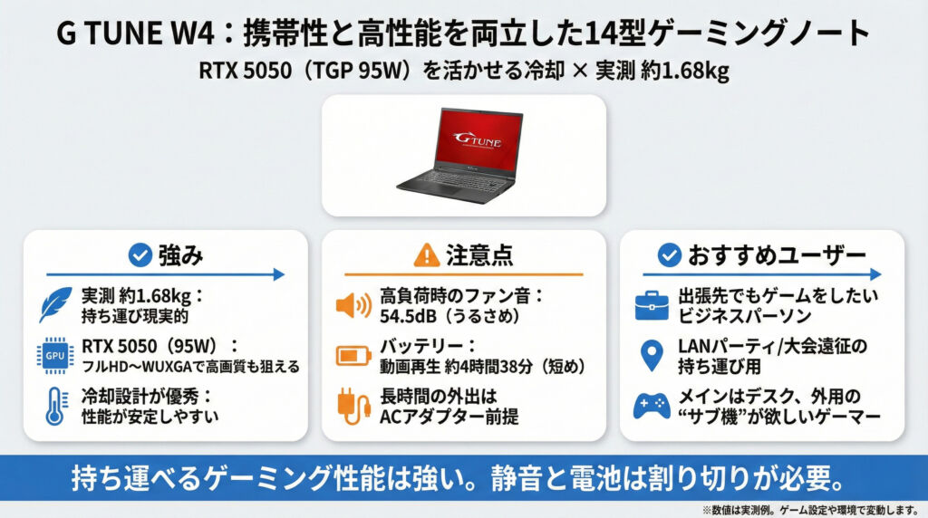 G TUNE W4は、RTX 5050 Laptop GPU(TGP 95W)の性能をしっかり引き出せる冷却設計を採用しつつ、約1.68kgに収まっているのが最大の魅力です。14型の持ち運びやすさとゲーミング性能を両立しており、フルHD〜WUXGAの範囲なら重量級タイトルでも十分に遊べるため、実際の運用で「性能不足」を感じにくい構成だと言えます。