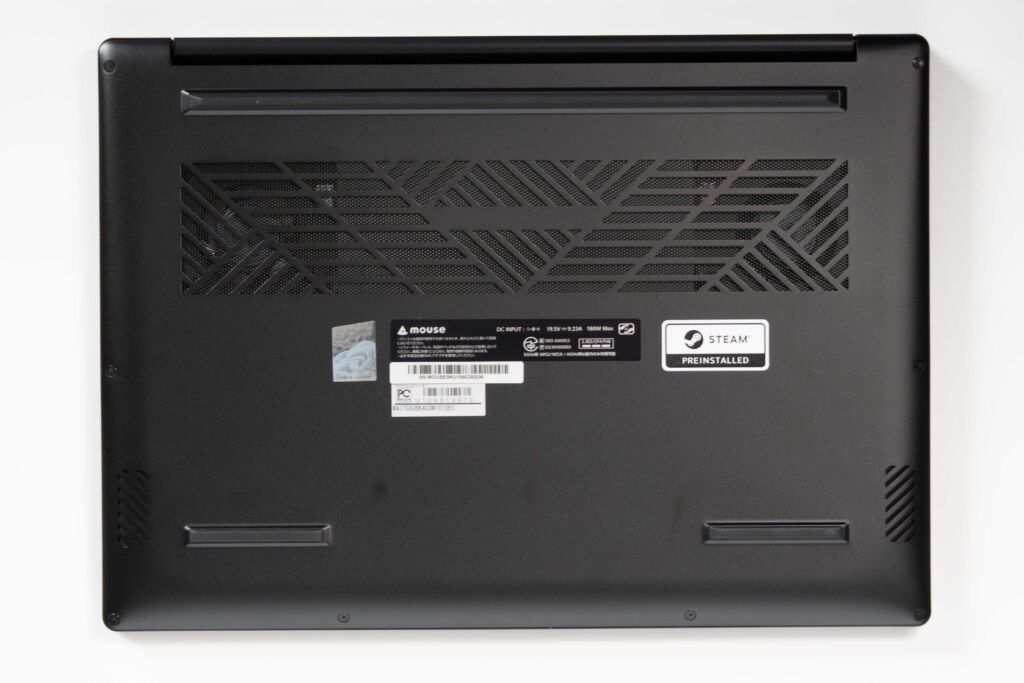 底面側も安っぽさはなく、見た目はかなりスタイリッシュです。中央上部に大きめの吸気グリルが配置されており、斜めのラインを組み合わせたパターンになっているので、機能優先の“穴だらけ”ではなく、デザインとして成立しているのが好印象でした。