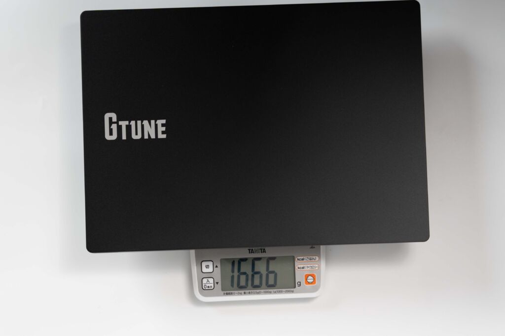 重量はかなり分かりやすい強みです。実測では、本体が 1,666g(約1.67kg)。14型のゲーミングノートとしてはしっかり持ち運び前提に入る重さで、「ゲーミング=2kg超えが当たり前」という層から見ると軽さが際立ちます。