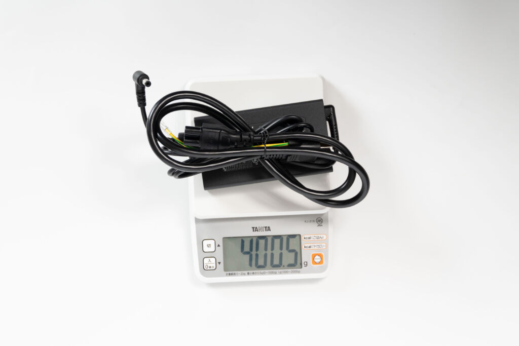 一方、ACアダプターは実測で 400.5g。持ち運び運用ではここも現実的に効いてくるので、合算すると 約2,066.5g(約2.07kg) になります。とはいえ、14型でこのクラスの性能を狙える構成としてはトータルでも十分軽量な部類で、LANパーティーや大会遠征のように「PC+電源をまとめて持ち出す」用途でも負担は抑えやすいです。