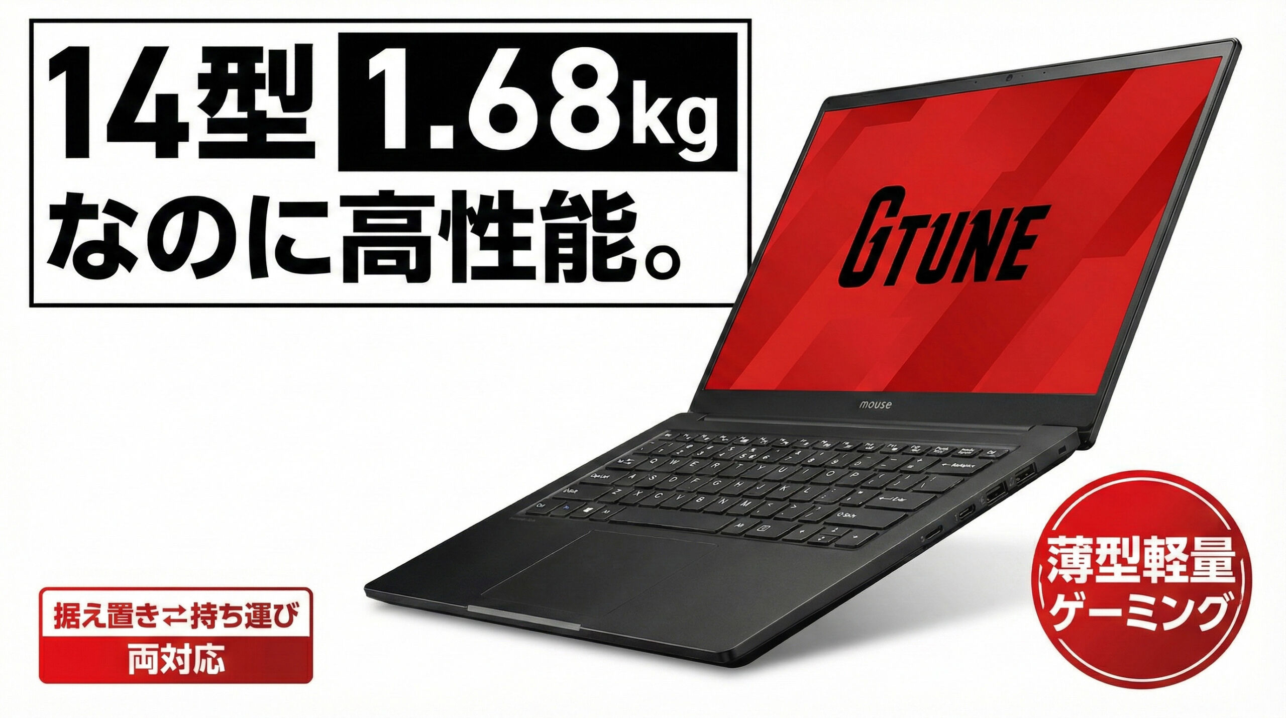 G TUNE W4-I7G50BK-Aは、14型のコンパクトさと、実測クラスで1.68kgという持ち運びやすい重量を両立したゲーミングノートPCです。ゲーミングノートは「性能は高いけど重くて持ち出しにくい」モデルが多い中、本機はモバイル用途も現実的にこなせる重量に収まっているのが大きな魅力です。