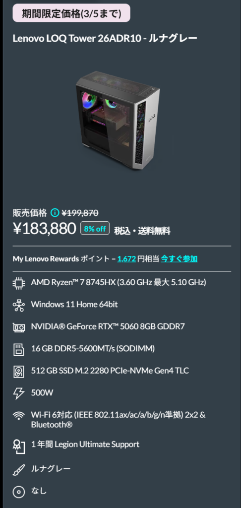 3/5までの¥183,880は、RTX 5060搭載のゲーミングデスクトップとして見ても最安級で、コスパはかなり強いです。