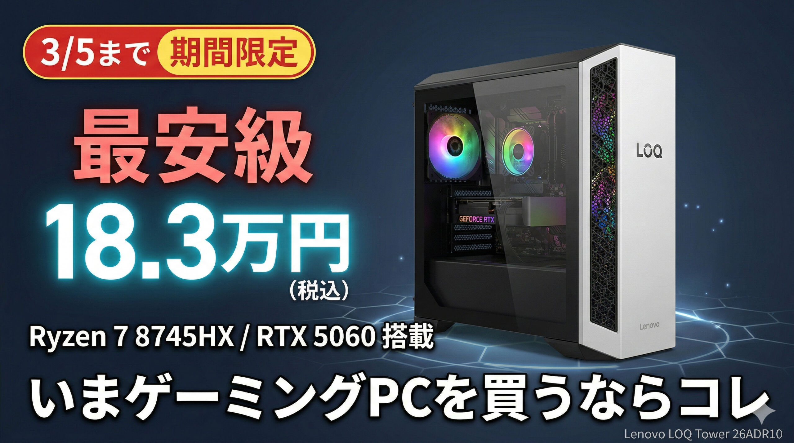 RTX 5060搭載のゲーミングPCは、20万円前後が当たり前になりつつある中で、Lenovo LOQ Tower 26ADR10が税込18.3万円(送料無料)まで落ちています(3/5までの期間限定価格)。