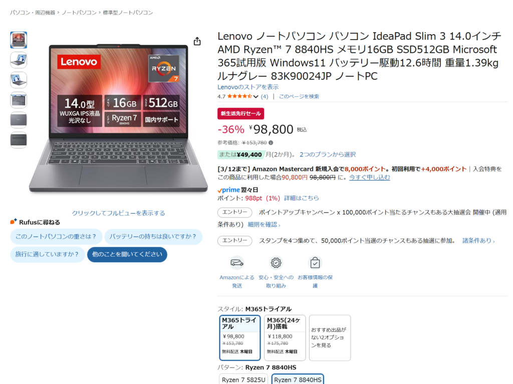 Amazonの新生活セールで Lenovo IdeaPad Slim 3(14.0インチ)が98,800円。構成は Ryzen 7 8840HS/メモリ16GB/SSD 512GB と、普段使いの範囲を明確に超えてくる“余裕のあるスペック”。