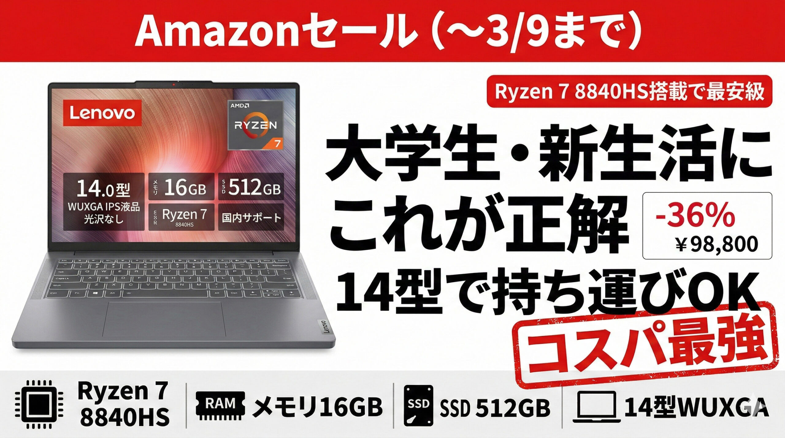 Amazonの新生活セールで Lenovo IdeaPad Slim 3(14.0インチ)が98,800円。構成は Ryzen 7 8840HS/メモリ16GB/SSD 512GB と、普段使いの範囲を明確に超えてくる“余裕のあるスペック”。