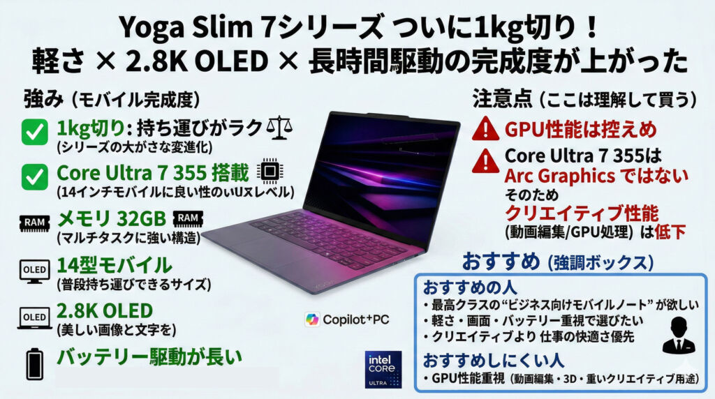 Yoga Slim 7シリーズで、ついに1kg切りを実現しました。重量級になりがちな高品質モバイルの枠でここまで軽くできたのは、かなり大きい進化です。
