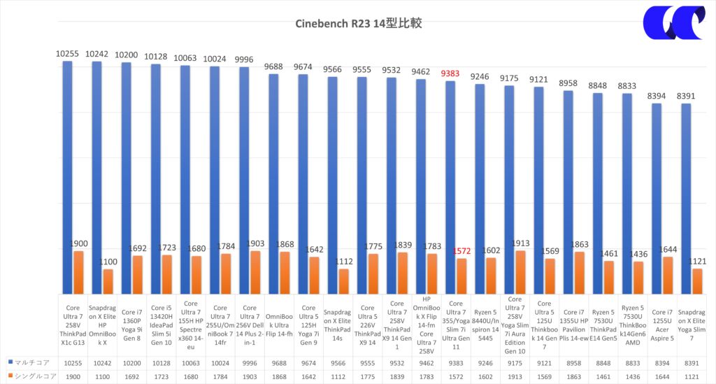 Cinebench R23のスコアは、マルチコア 9,383 pts/シングルコア 1,572 ptsでした。14型モバイルとしては“十分使える”水準ですが、グラフで見ても分かる通り、最上位クラスの伸び方ではありません。