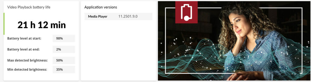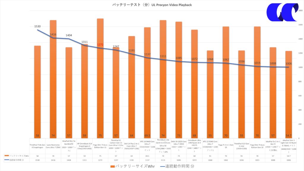 バッテリー駆動時間(UL Procyon Video Playback)は、21時間12分でした。