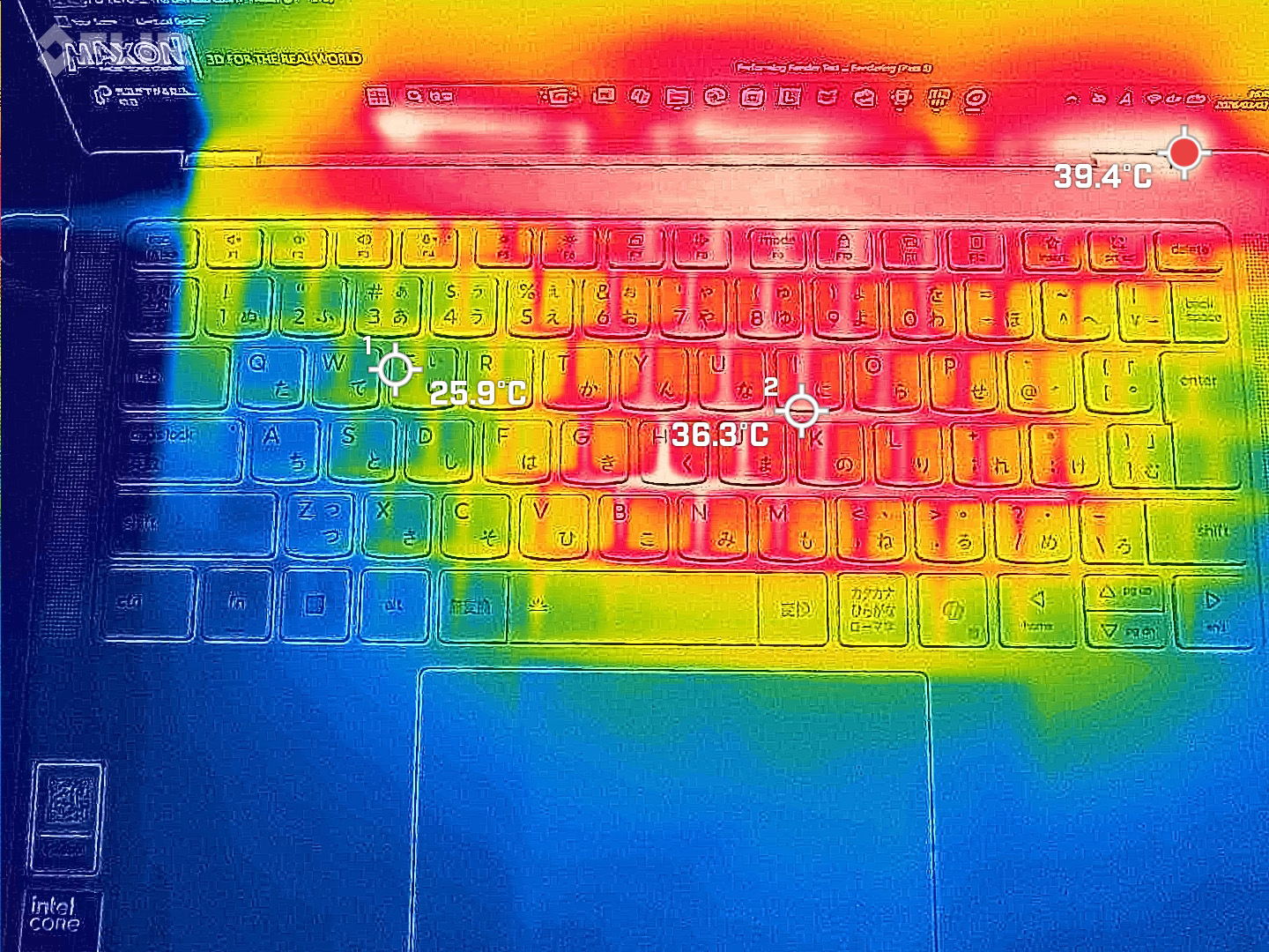 高負荷時の表面温度は、全体として人肌程度に抑えられています。サーモ画像を見ると、もっとも熱いのは上部(ヒンジ寄り)で約39.4℃、キーボード中央付近でも約36.3℃程度。