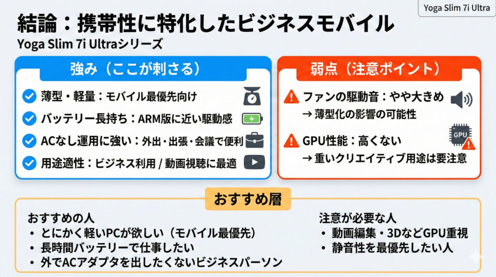 Yoga Slim 7i Ultraシリーズは、薄型・軽量で持ち運びやすく、さらにバッテリー駆動時間が長い(ARM版に迫るレベル)のが大きな魅力です。外出先や出張先で、長時間ACアダプターに繋がずに使うシーンに強く、ビジネス用途+動画視聴といった“ビジネスパーソンの普段使い”にしっかりハマります。とにかく軽いので、モバイル優先で選びたい人にはかなりおすすめです。