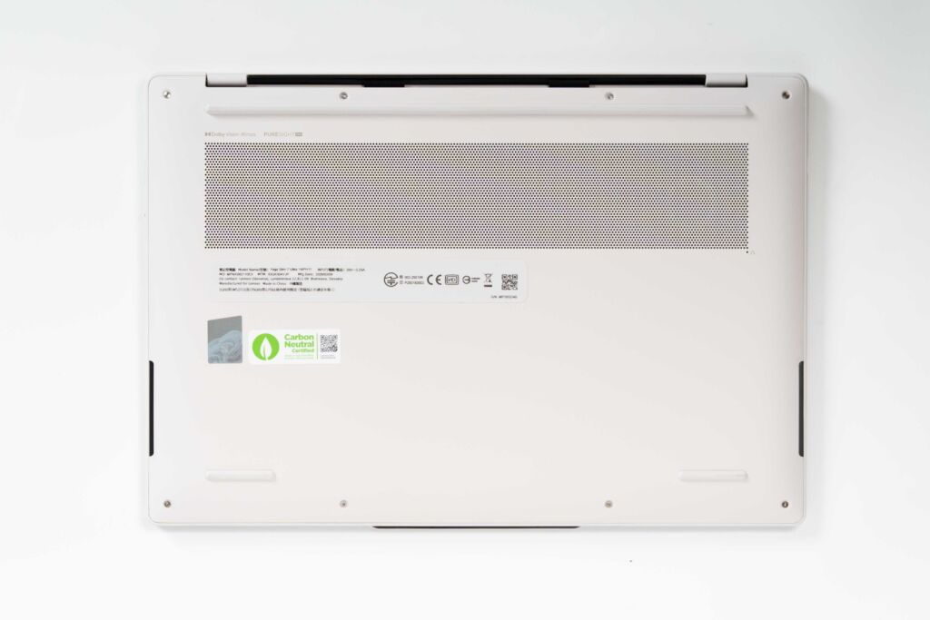 底面側を見ると、吸気用の開口部が大きめに取られており、エアフローをしっかり確保しているのが分かります。排気側も抜け道がきちんと作られていて、薄型・軽量モデルでも冷却を成立させる設計になっています。