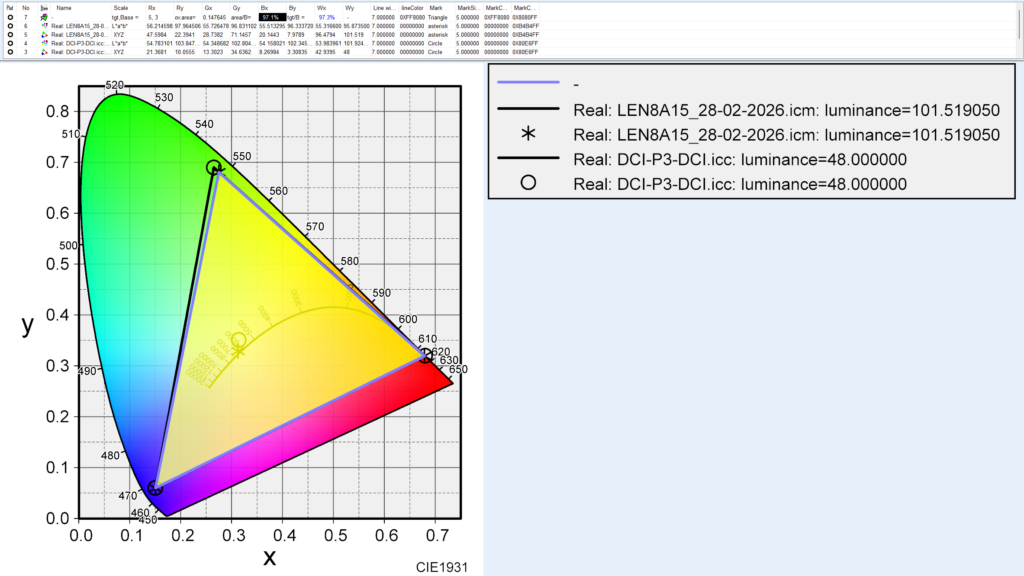 色域は測定結果で、DCI-P3カバー率97.6%でした。