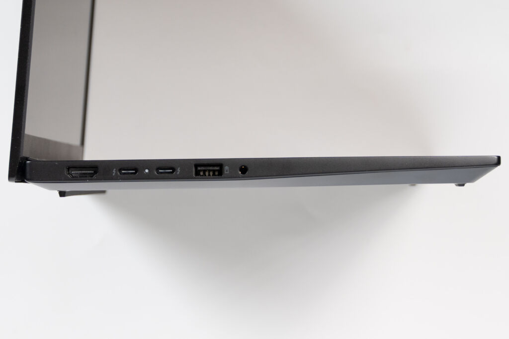 搭載端子は、USB 3.2 Gen 1、RJ-45、有線LAN、ケーブルロックスロット、HDMI、USB4(Thunderbolt 4対応)、USB 3.2 Gen 2、マイク/ヘッドホンコンボジャックと充実しています。最近は薄型化の影響でUSB-C中心の構成になるモデルも増えていますが、本機はUSB-Aや有線LAN、HDMIもきちんと備えているため、変換アダプターなしでもそのまま使いやすいです。
