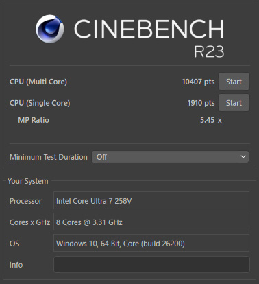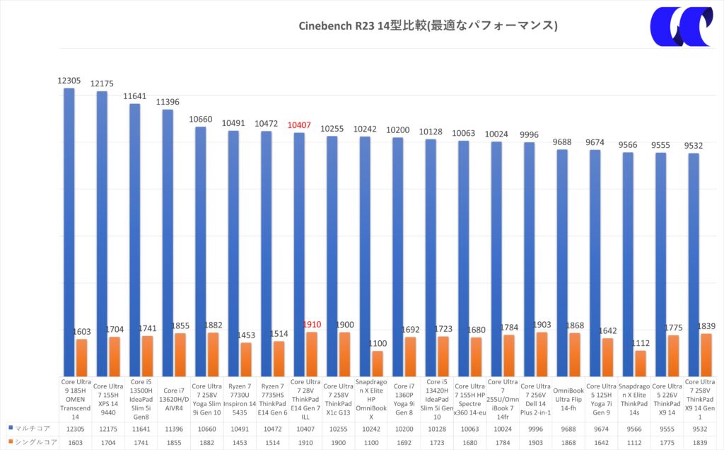 ThinkPad E14 Gen 7 ILL(14型 Intel)は、Cinebench R23でシングルコア1,910pts、マルチコア10,407pts でした。14型のビジネスノートPCとして見ると、シングルコア性能はかなり高めで、マルチコア性能もしっかり実用的な水準です。