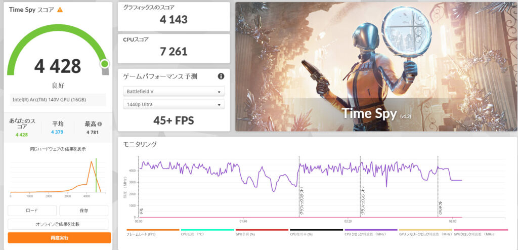特にこのクラスの14型ノートPCでTime Spy 4,000点台に乗っているのは悪くなく、“内蔵GPUとしてはしっかり高性能” と言っていい結果です。もちろん本格的なゲーミングノートPCのように重いゲームを高画質で快適に遊ぶのは難しいですが、設定を調整すれば軽量級~中量級タイトルをある程度楽しめる可能性があります。