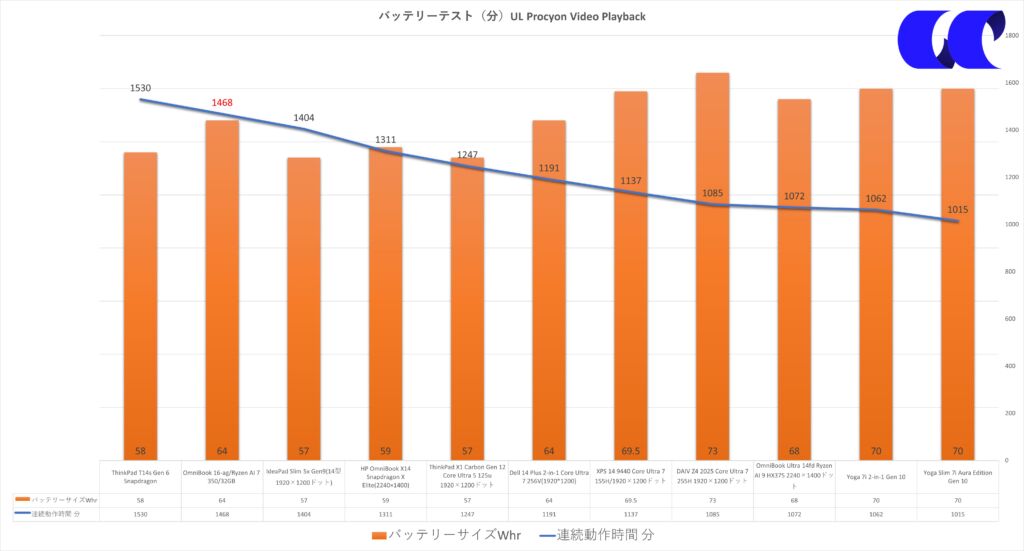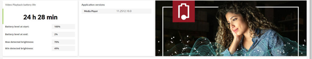 PC内部に保存されたHD画質の動画をループさせてバッテリーの連続動作時間を計測するベンチマークソフトの結果です。
