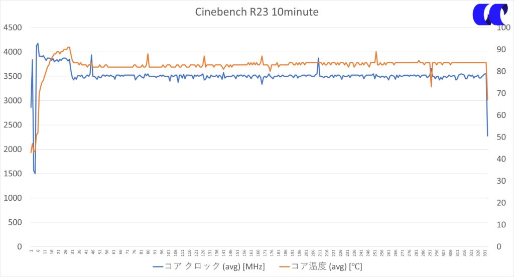 Cinebench R23の10minuteテストでCPU使用率を100%にし、PCの温度を確認します。