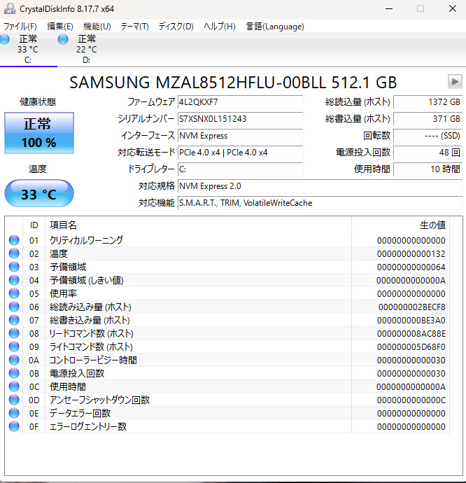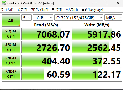 ThinkPad E14 Gen 7 ILL(14型 Intel)に搭載されていたSSDは、Samsung製の512GB NVMe SSDでした。CrystalDiskMarkの実測では、シーケンシャルリードが7,068MB/s、シーケンシャルライトが5,917MB/sという非常に高速な結果が出ています。