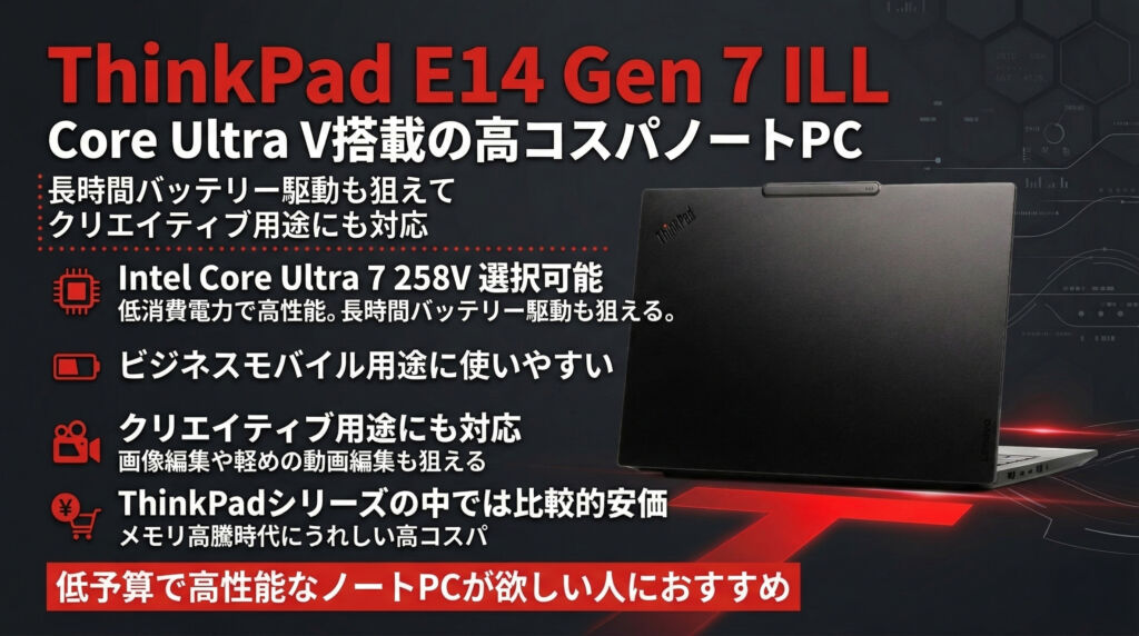 ノートPC全体が高価格化している今、価格を抑えつつも品質の高いモデルを選びたい人には、ThinkPad E14 Gen 7 ILL(14型 Intel)はかなり有力な選択肢です。