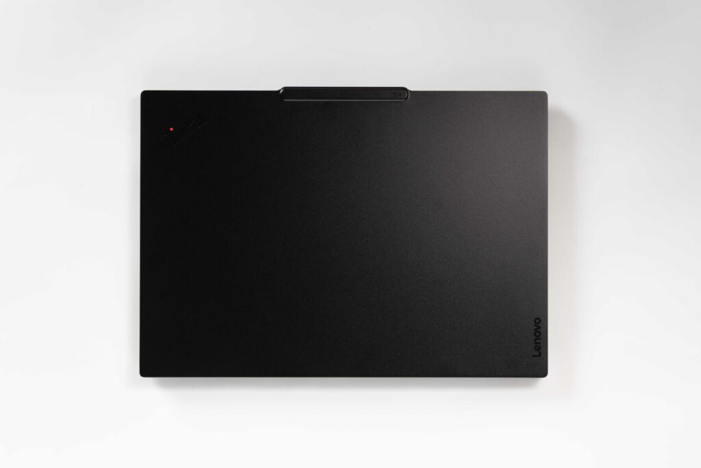 特にいいのは、Lenovoロゴの主張が控えめなところです。ブランド名を必要以上に目立たせない配置になっており、全体としてすっきり見えるため、デザイン面でもよく配慮されていると感じます。ThinkPadロゴもいつもの位置に収まっており、シリーズらしさはしっかり残しつつ、見た目はかなりスマートです。