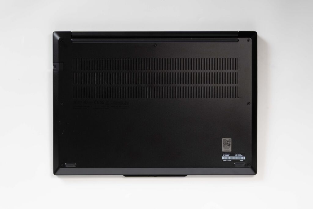 底面を見ると、吸気用のスリットが大きめに確保されているのがわかります。エントリー寄りのビジネスノートPCだと、冷却まわりが控えめな設計になっていることもありますが、本機はしっかり吸気面積を取っており、CPU性能を出しやすい構造です。