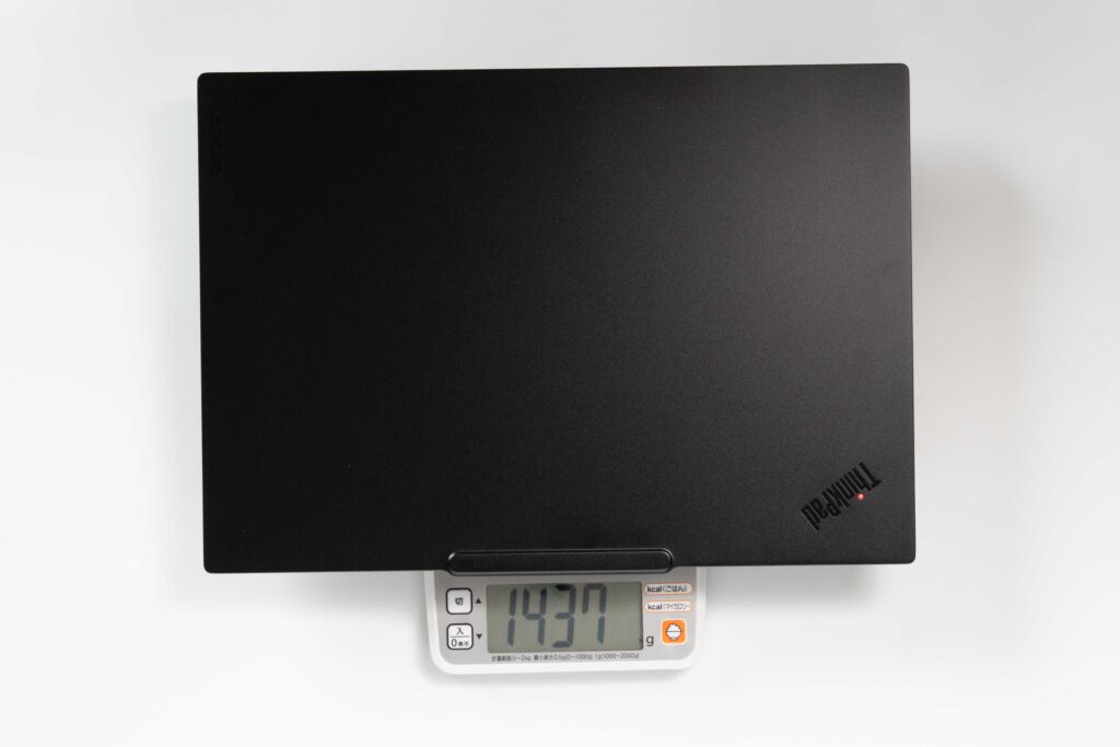 ThinkPad E14 Gen 7 ILL(14型 Intel)の実測重量は、本体が約1,437g、ACアダプターを含めた総重量は約1,698gでした。