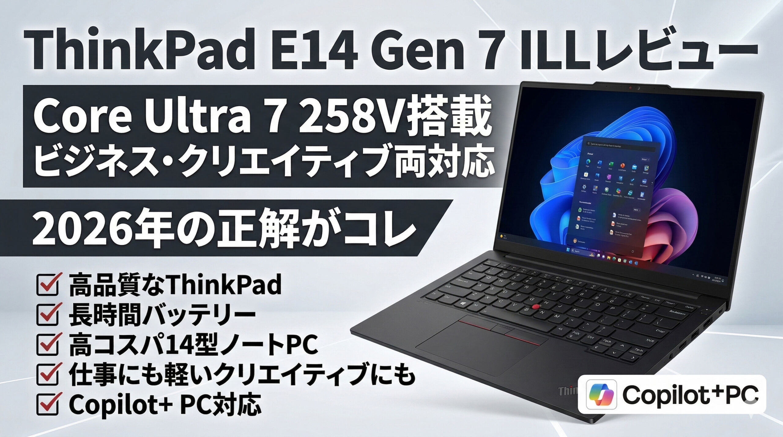 ThinkPad E14は、ThinkPadシリーズのなかでは比較的手頃な価格で購入できる廉価モデルです。ただし、今回のThinkPad E14 Gen 7 ILL(14型 Intel)は、Intel Core Ultra 7 258V を選択できる点が大きな魅力です。