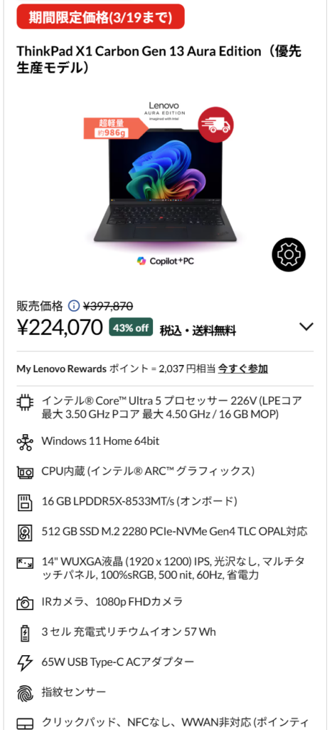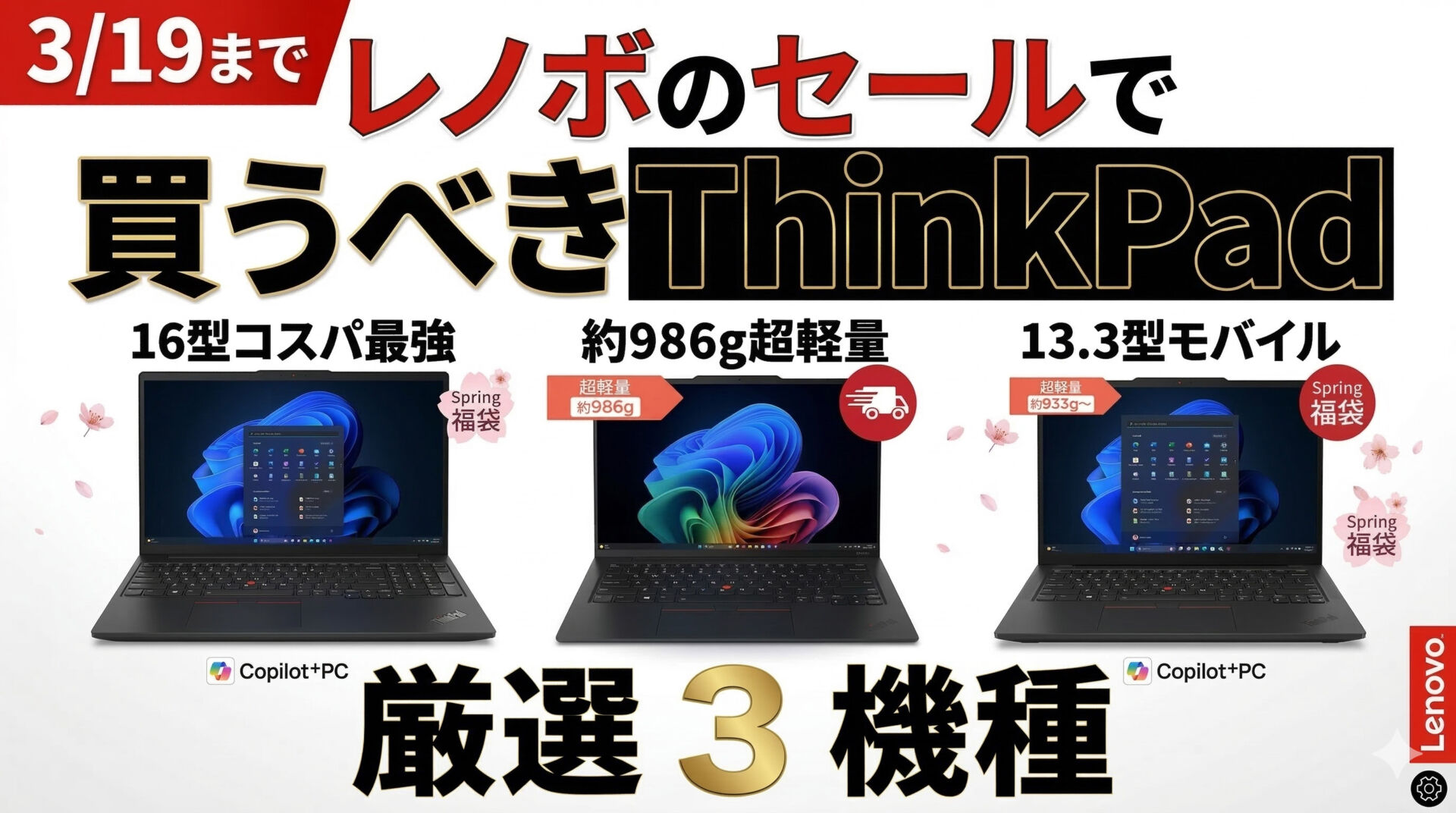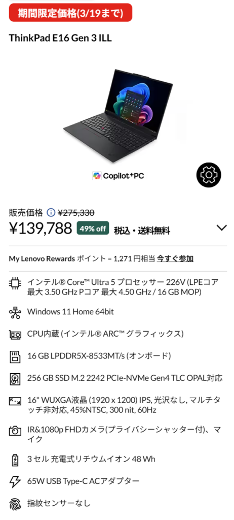 レノボでは3月19日までセールを開催中で、ThinkPadシリーズもかなり狙い目の価格になっています。