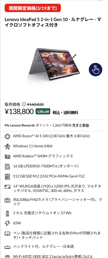 レノボでは3月19日まで期間限定セールを開催中で、10万円台でもかなり実用的なノートPCが選びやすくなっています。