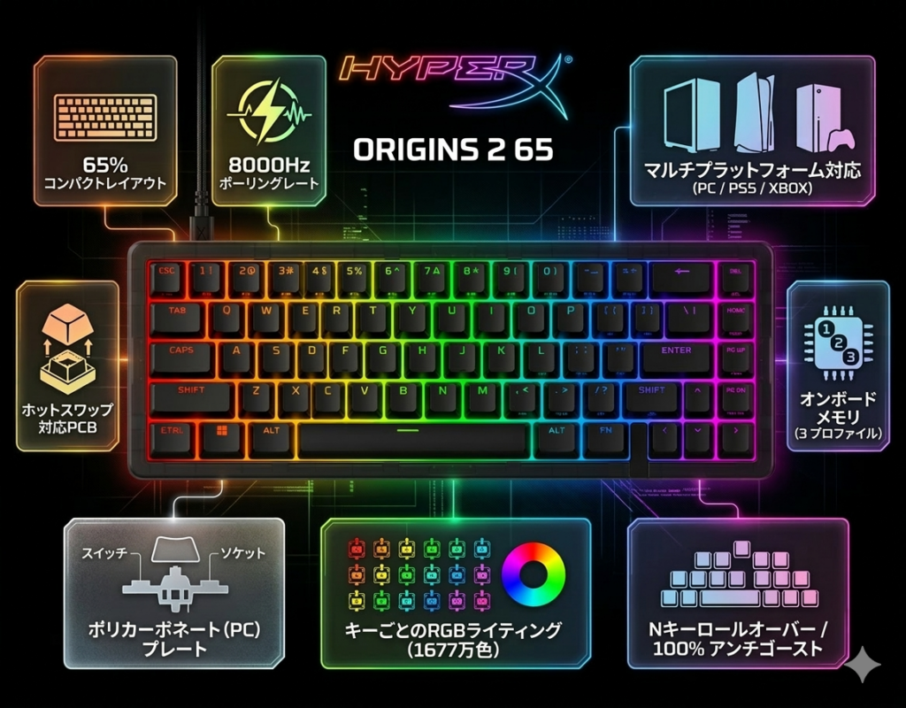 HyperX Origins 2 65 は、コンパクトサイズと高性能を両立したゲーミングキーボード です。