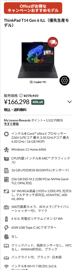 ThinkPad T14 Gen 6 ILLは、今回の3機種のなかでもっとも価格を抑えやすい14型モデルです。販売価格は166,298円で、ThinkPadらしい使いやすさを確保しつつ、導入コストを下げたい人に向いています。