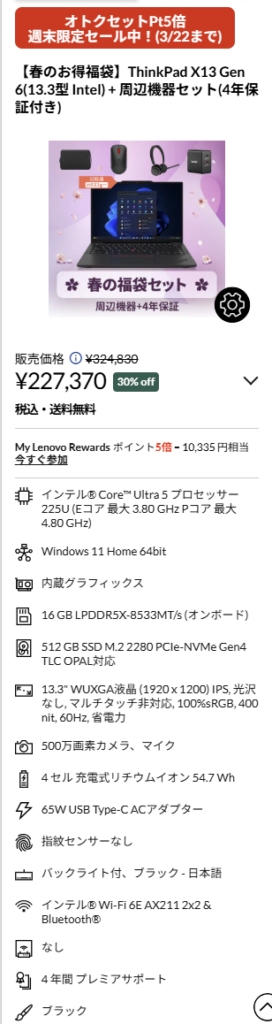 ThinkPad X13 Gen 6は、13.3型のコンパクトさと、4年保証付きの周辺機器セットが特徴のモデルです。価格は227,370円で、X1 Carbonに近い価格帯ではありますが、セット内容込みで見ると導入しやすさがあります。