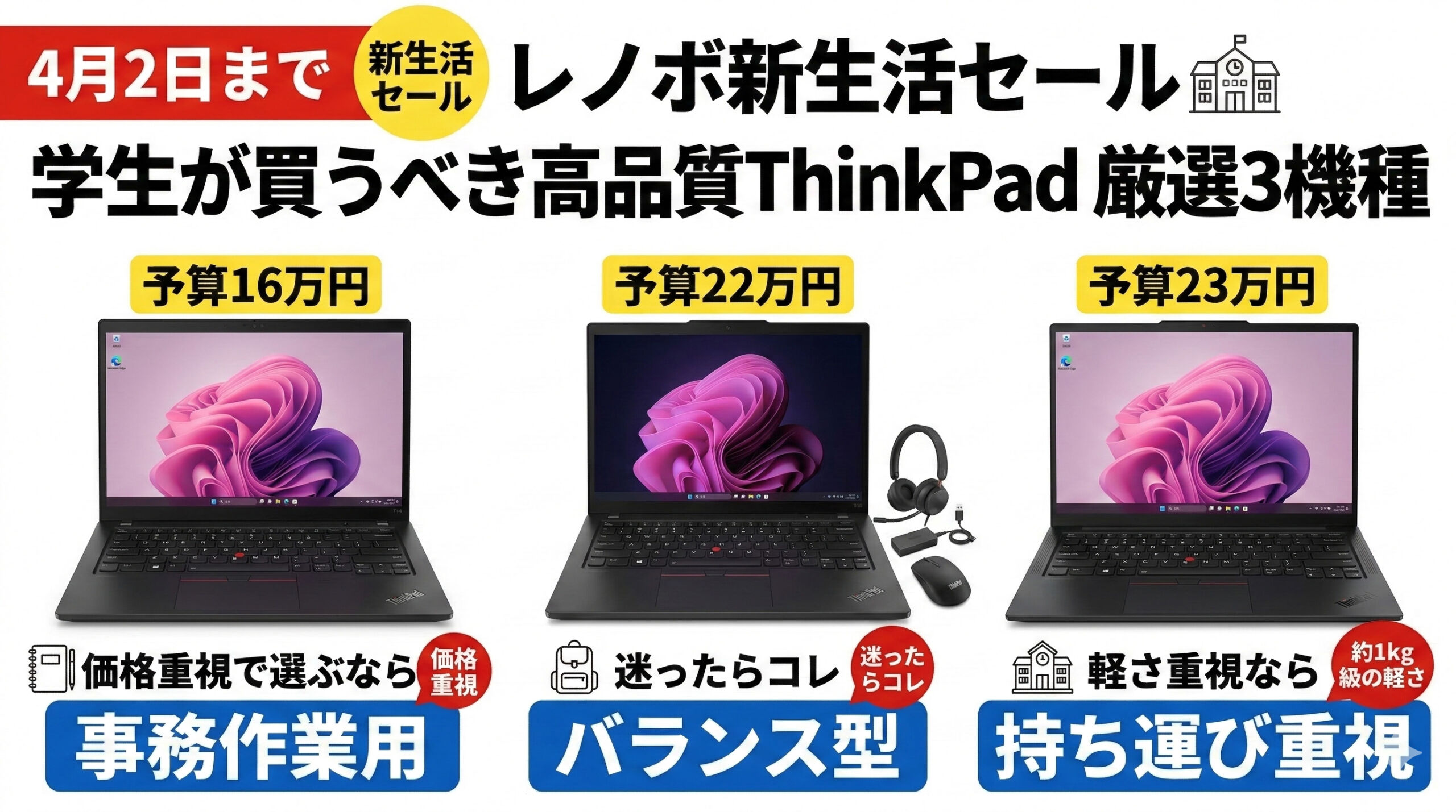 そこで今回は、4月2日までのレノボセールで購入しやすいThinkPadのなかから、新生活におすすめしやすい3機種を厳選しました。