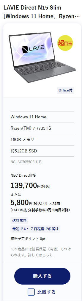 価格も139,700円(税込)と、NECブランドの中では比較的手が届きやすい水準です。